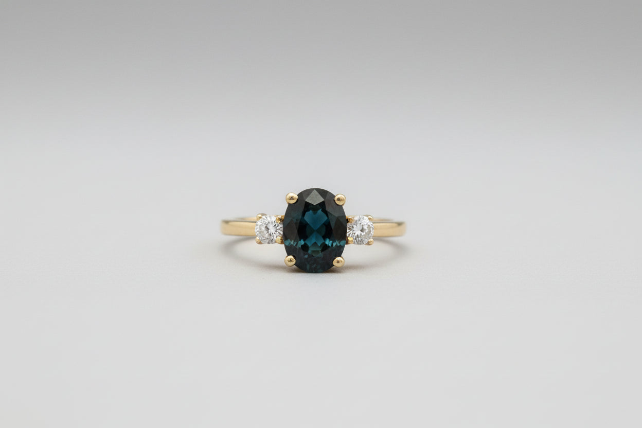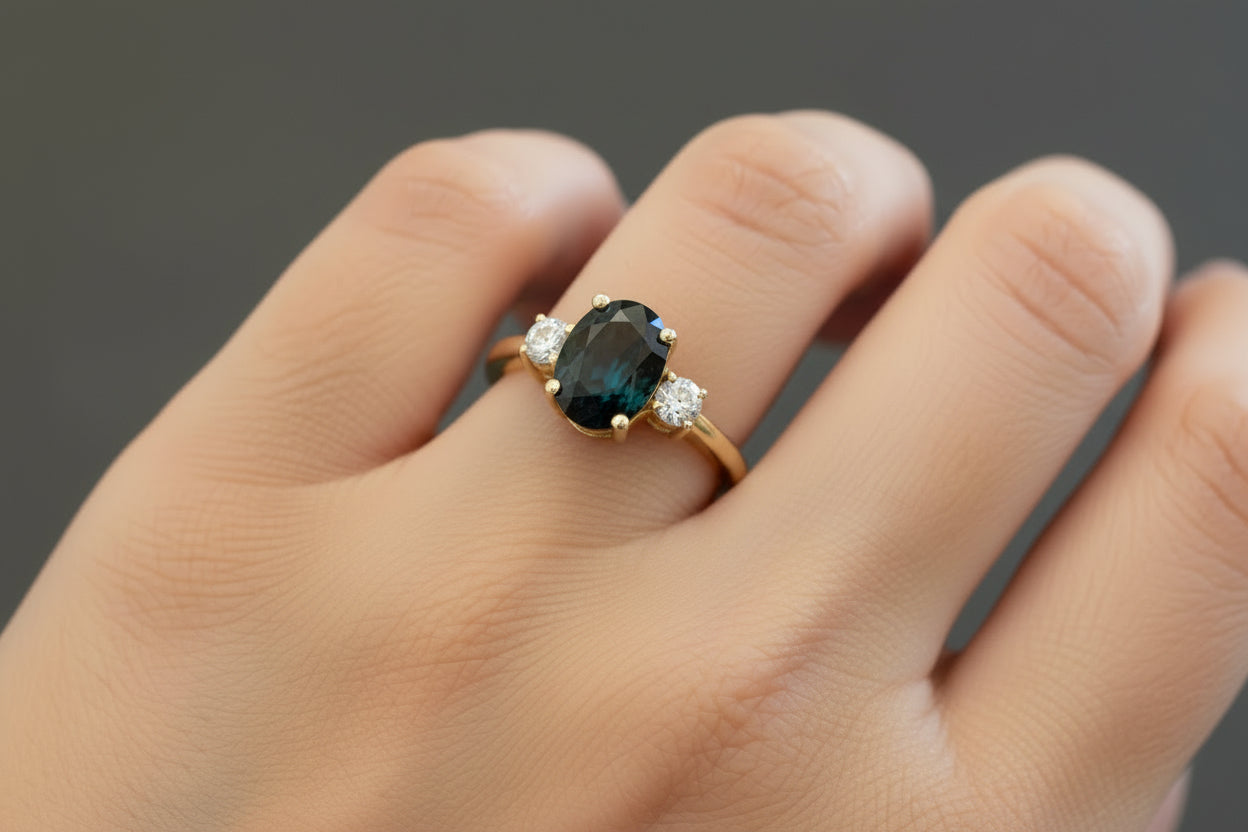 גוון הירוק העמוק של הספיר מעניק לטבעת מראה עוצמתי, נדיר ואלגנטי, והיהלומים משני הצדדים מוסיפים ברק נקי שמדגיש את האבן המרכזית.