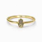 טבעת זהב 14 קראט עדינה בעיצוב חמסה קלאסי, משובצת אבני זירקון נוצצות במרכז הטבעת. העיצוב משלב סמליות של הגנה וברכה עם מראה אלגנטי ונשי. טבעת מינימליסטית עם נוכחות עדינה, מושלמת לענידה יומיומית או כשילוב עם טבעות נוספות.