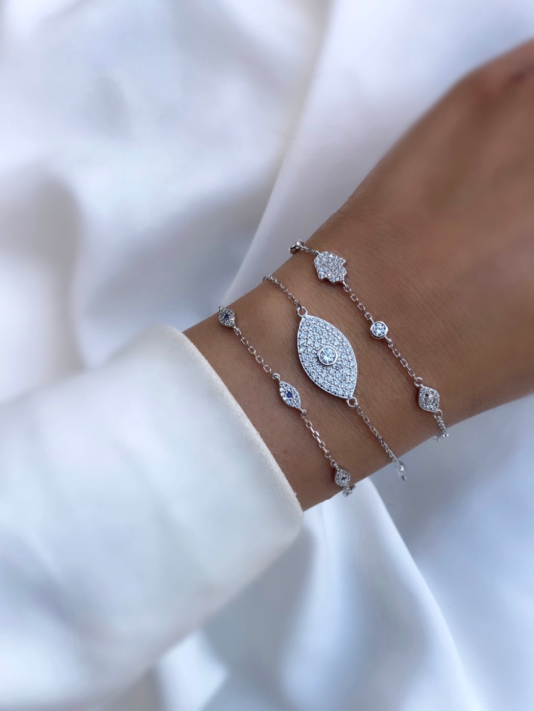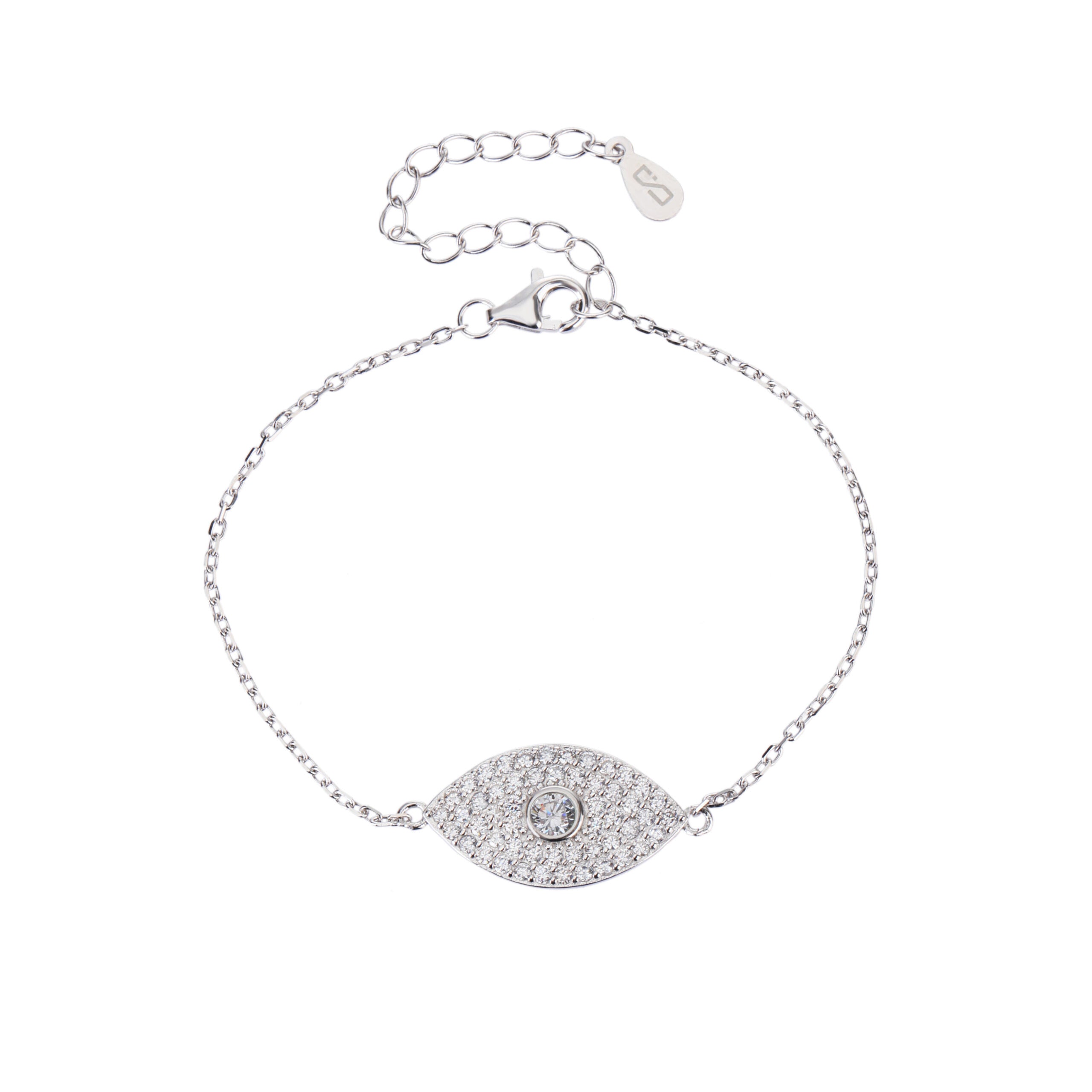 צמיד עדין ומלא נוכחות, עשוי כסף סטרלינג 925 ומשולב חרוזים מבריקים ותליון עין בעיצוב נקי ומודרני.