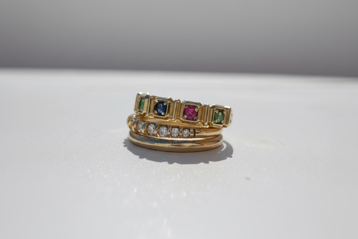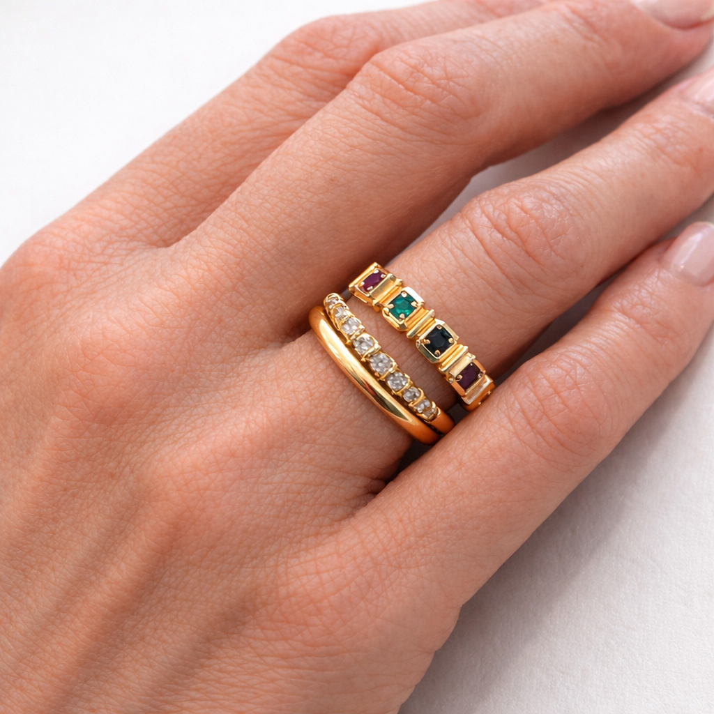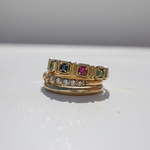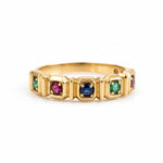 טבעת זהב 14 קראט בעיצוב ייחודי ונוכחות מרשימה, משובצת חמש אבני חן טבעיות בגווני רובי, אמרלד וספיר.