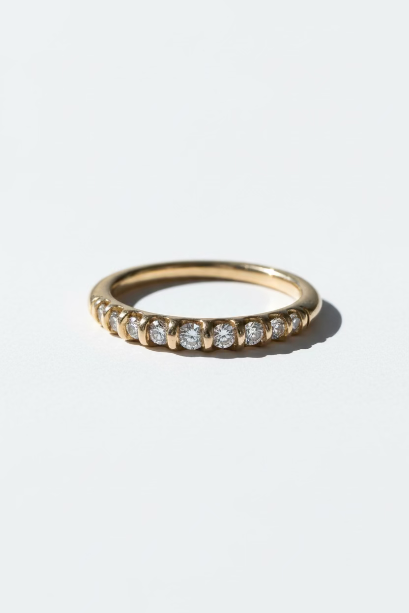בין כל יהלום מופיעים חריצים עדינים בזהב שמבליטים את עבודת המתכת ומוסיפים עומק וטקסטורה לעיצוב. השילוב בין היהלומים לבין הזהב החשוף מעניק לטבעת מראה יוקרתי, נקי ומיוחד.
