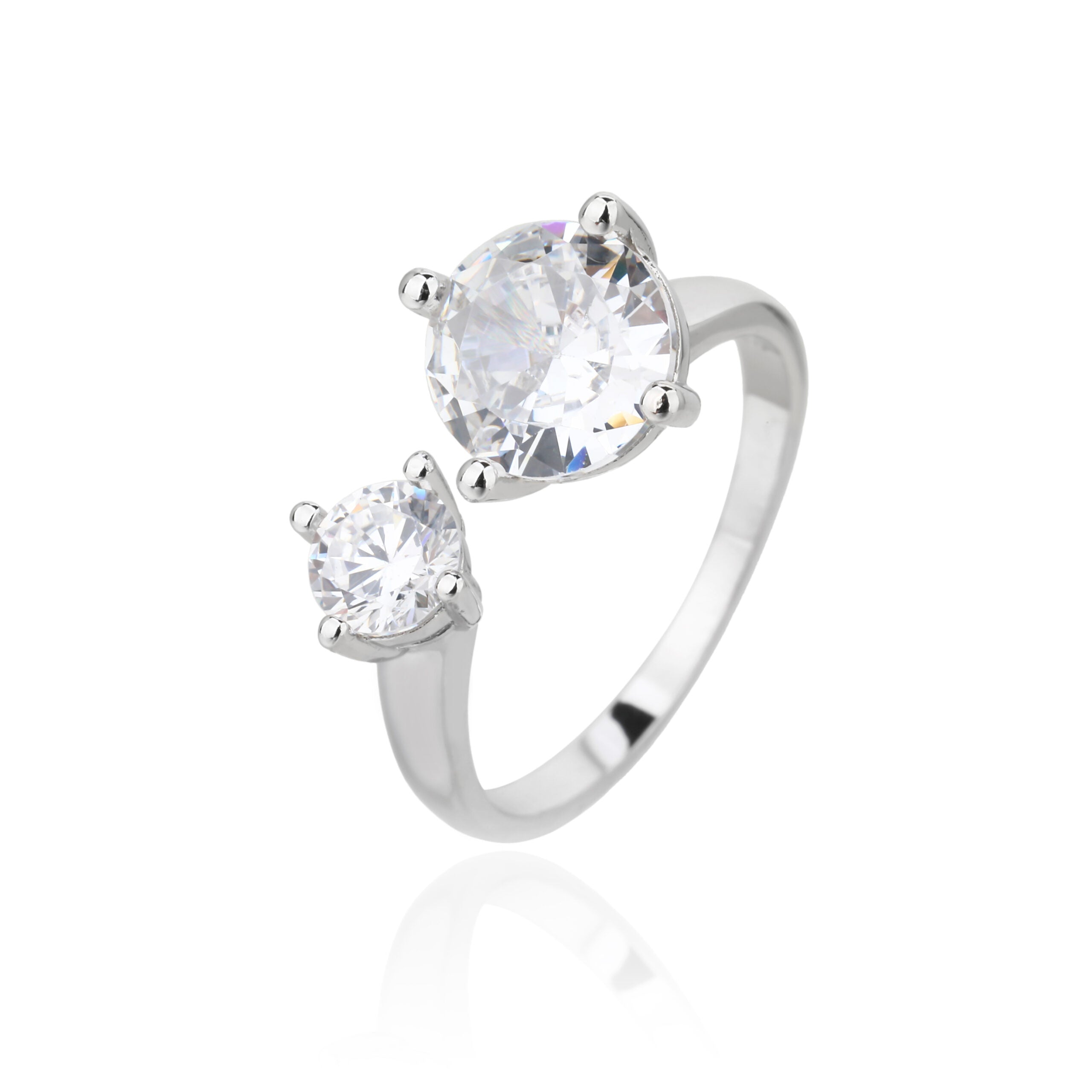 טבעת כסף 925 בעיצוב פתוח ועדין, משובצת שני זירקונים בגדלים שונים היוצרים מראה מודרני וא-סימטרי מושלם.