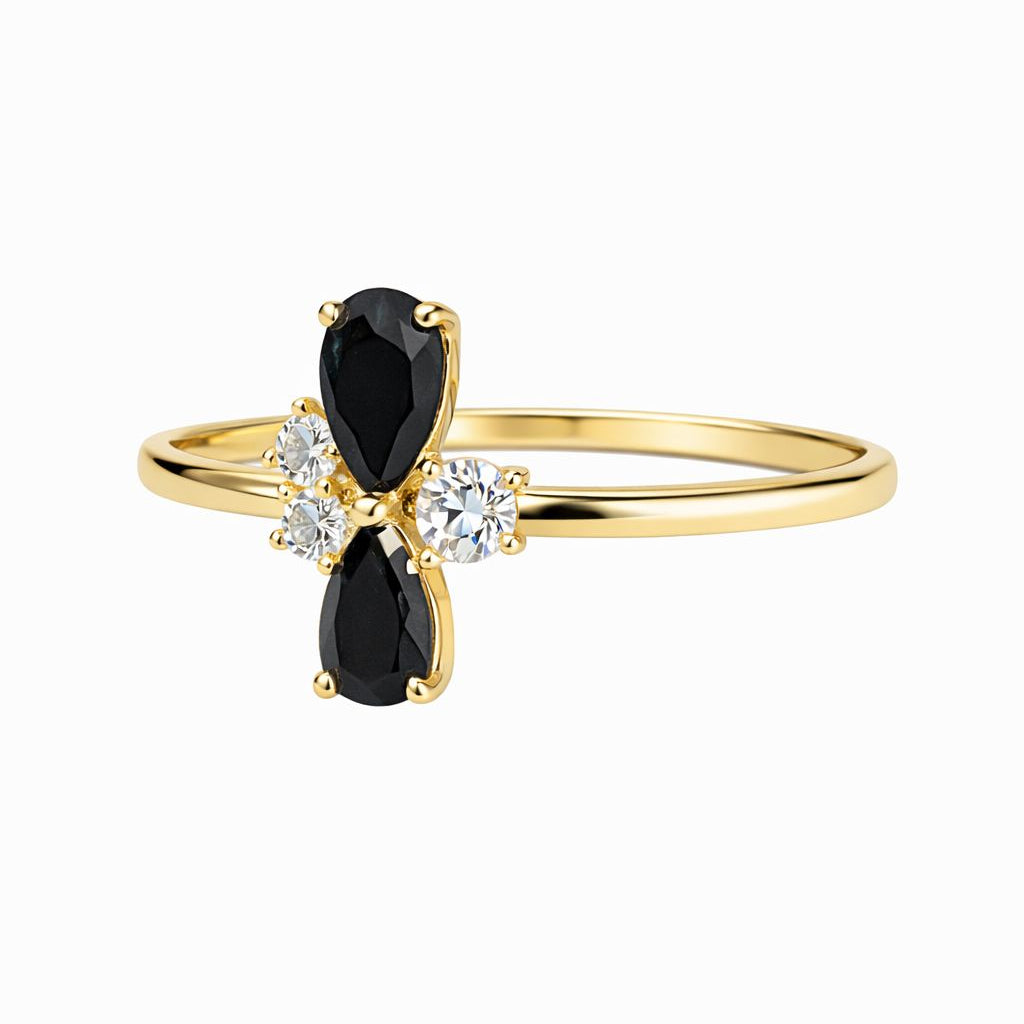 טבעת יוקרתית ועדינה עשויה זהב 14K אמיתי, משובצת אבני זירקון שחורות בצורת טיפה, בשילוב אבני זירקון לבנות נוצצות במרכז, ליצירת עיצוב אלגנטי ומרשים א סימטרי