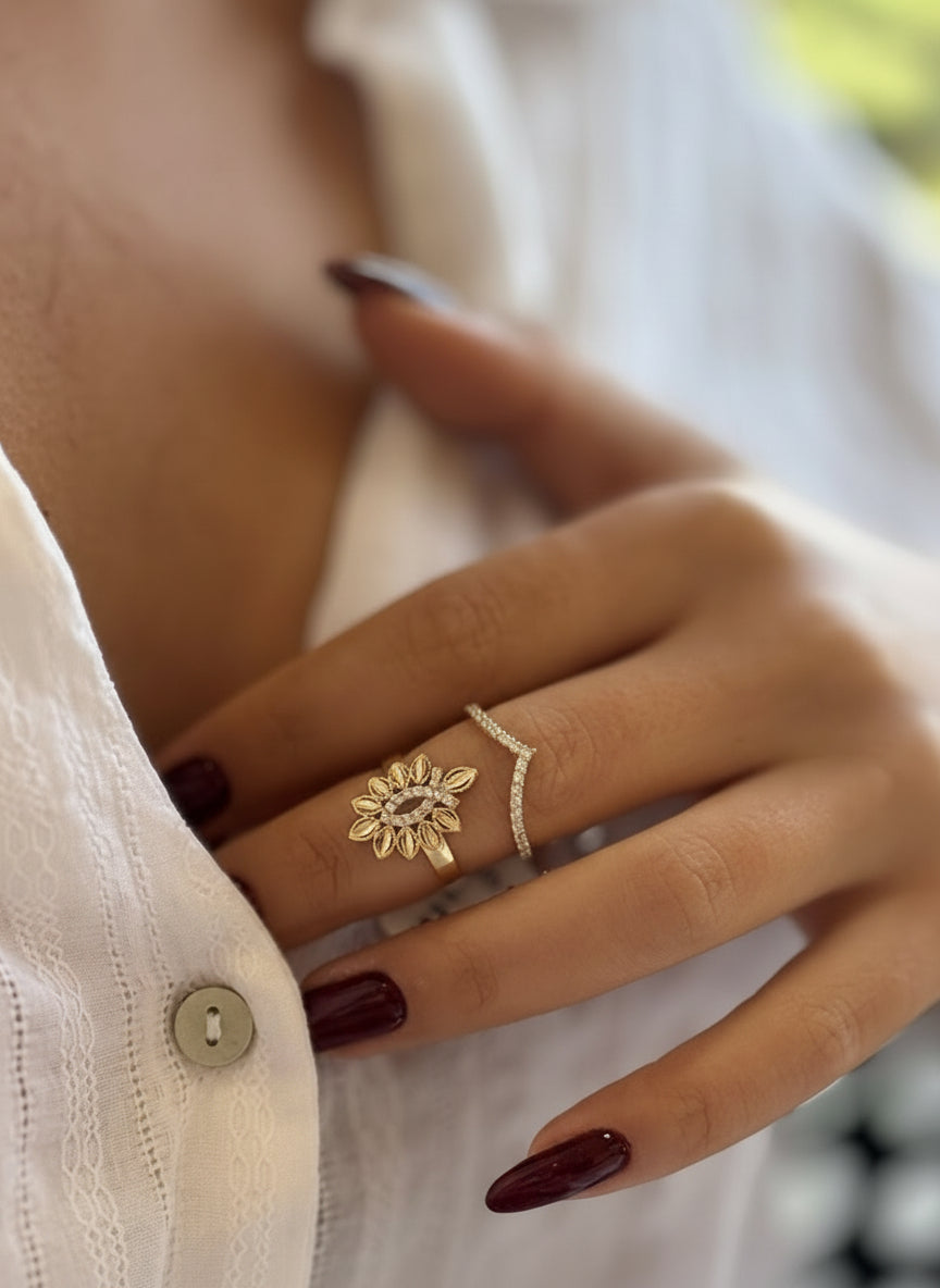 טבעת זהב 14K בעיצוב אלגנטי בהשראת פרח פתוח, עם עלי כותרת מעוצבים ואלמנט עגול מרכזי המשובץ אבנים קטנות ומבריקות. העיצוב מוקפד, נשי ומאוזן, ומשלב נוכחות עדינה עם קלאסיות על זמנית.