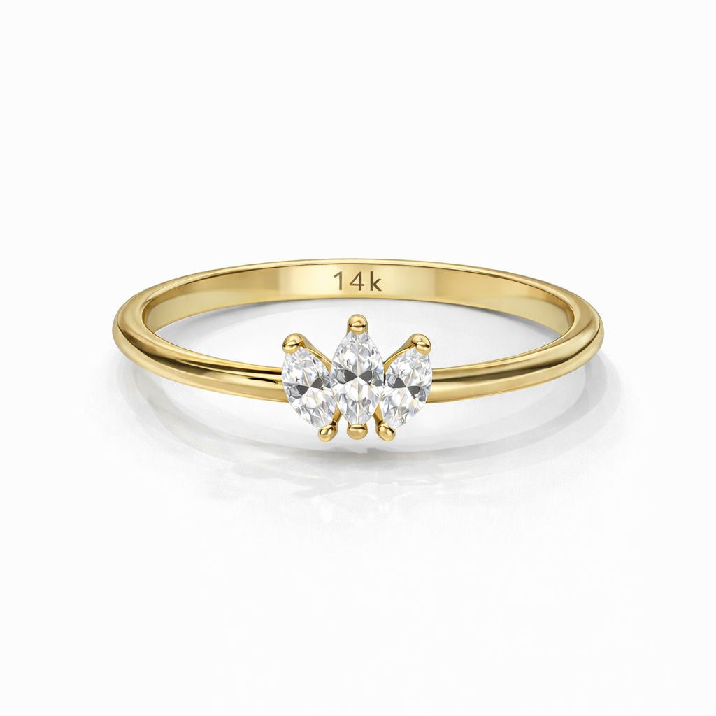 טבעת זהב 14 קראט עדינה ואלגנטית, משובצת שלוש אבני זירקון בגזרת מרקיז (Marquise) המסודרות בקו מרכזי הרמוני. עיצוב נקי ומודרני עם נוכחות עדינה, המעניק מראה יוקרתי אך מינימליסטי. מושלמת לענידה יומיומית, לשילוב עם טבעות נוספות או כטבעת עדינה בפני עצמה.