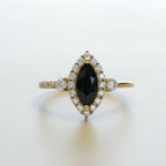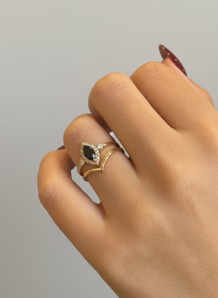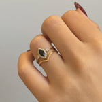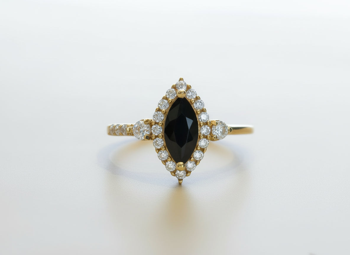 טבעת זהב 14K בעיצוב אליפטי מוקפד, במרכזה אבן שחורה עמוקה שיבוץ עדין מצד אחד של הטבעת ..