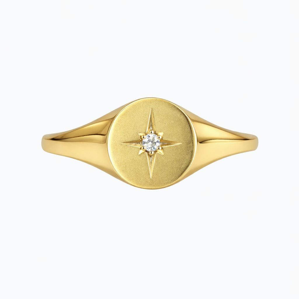 טבעת חותם זהב 14K עם כוכב מצפן זרקון מרכזי