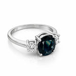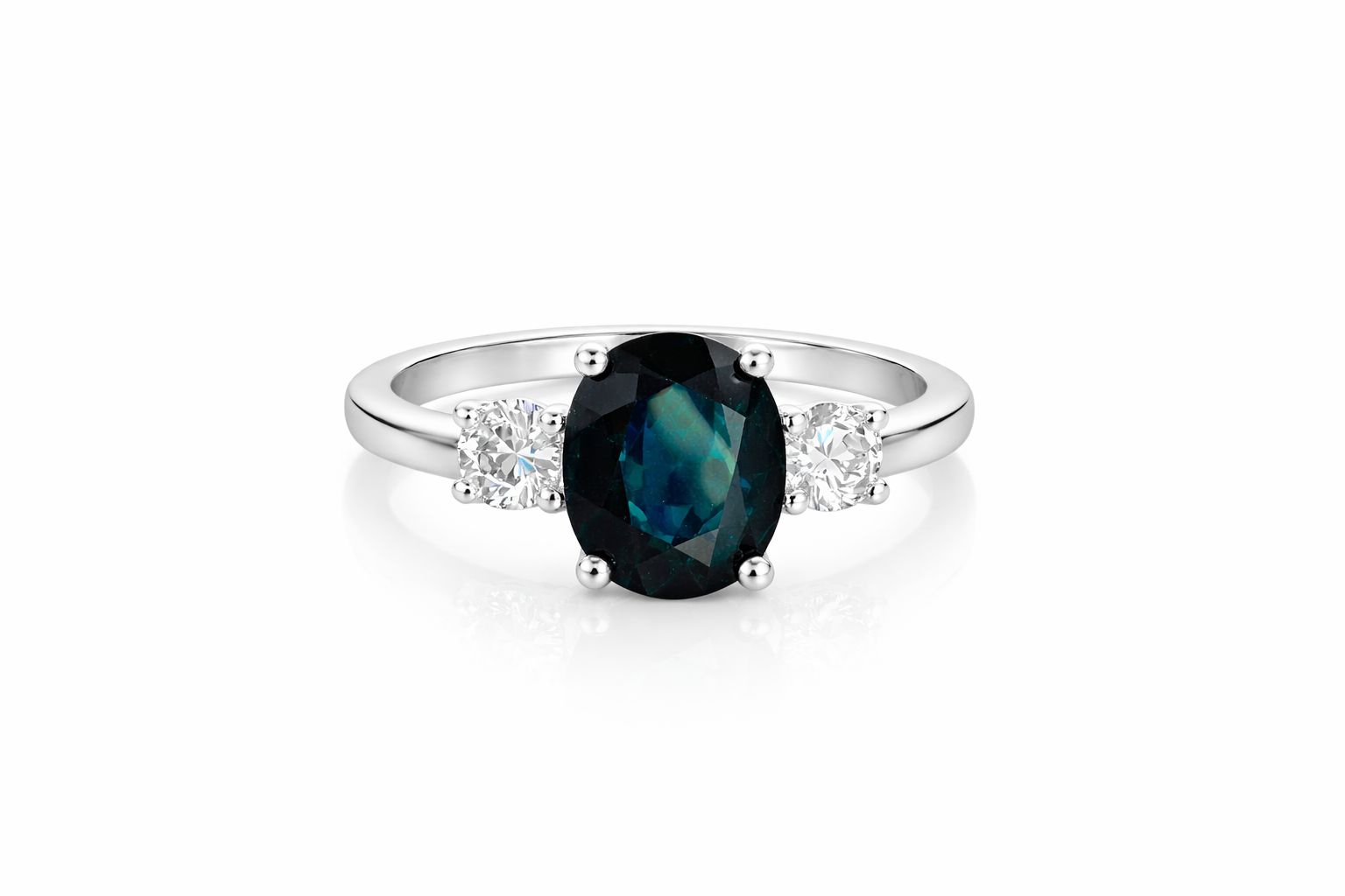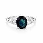 טבעת זהב לבן 14 קראט בעיצוב אלגנטי ועל־זמני, משובצת אבן ספיר טבעית מרשימה במרכז, במשקל 2.4 קראט, ולצידה שני יהלומים טבעיים איכותיים במיוחד.
