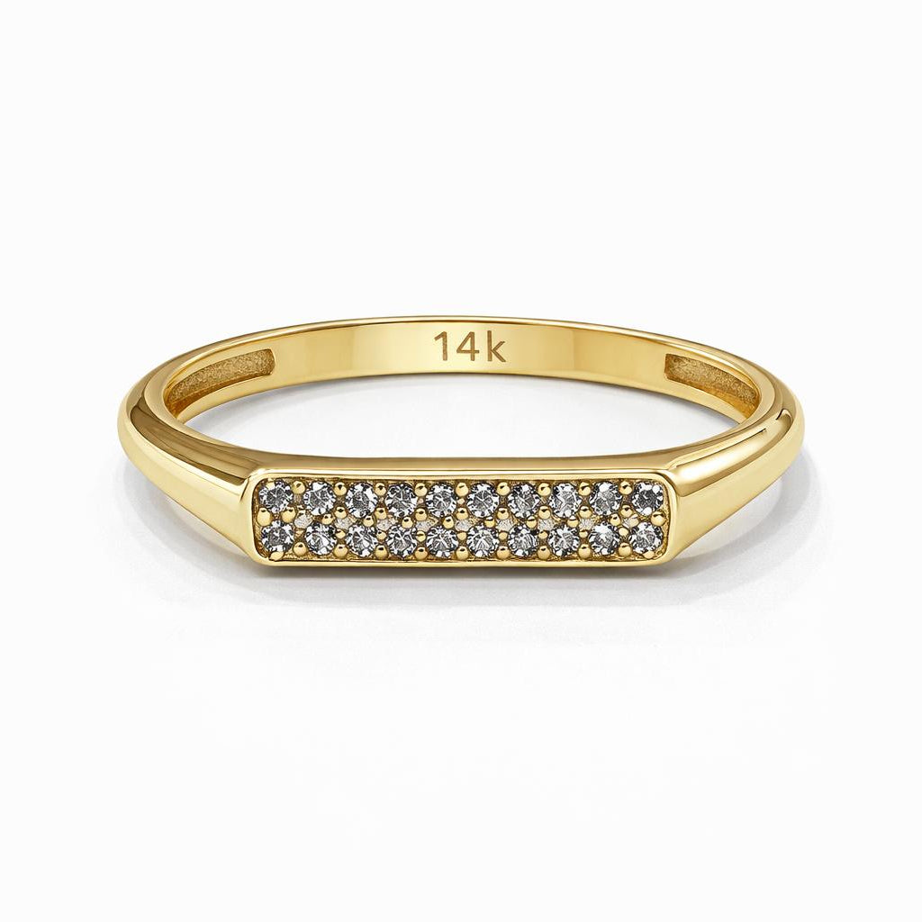 טבעת זהב 14 קראט בעיצוב נקי ומודרני, עם פלטה מלבנית משובצת אבני זירקון נוצצות בשיבוץ צפוף ועדין. הטבעת משלבת מראה אלגנטי עם קווים ישרים וגימור מבריק, ומתאימה לענידה יומיומית או כשכבה מושלמת בשילוב טבעות נוספות. עיצוב מינימליסטי עם נוכחות יוקרתית.
