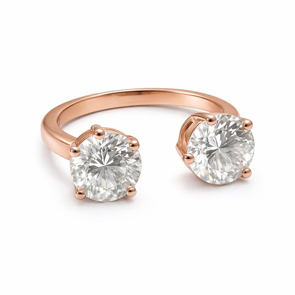 טבעת יוקרתית ומרשימה העשויה זהב מלא 14 קראט, בעיצוב פתוח ועכשווי, המשובצת בשני יהלומי מעבדה עגולים במשקל כולל של 2 קראט – כל אבן בגודל 1 קראט.