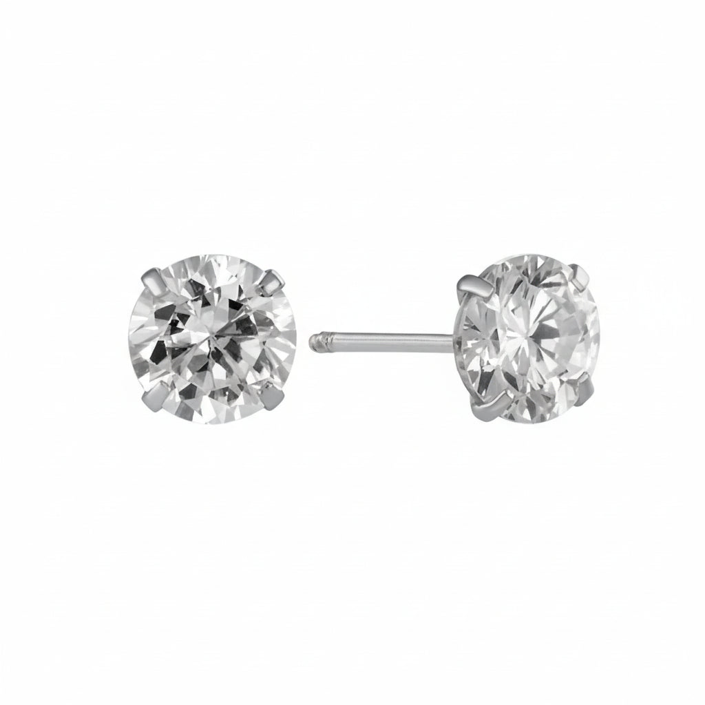 עגילי סטאד מזהב לבן 14K בעיצוב קלאסי, עם אבן זרקון מבריקה בקוטר 4 מ״מ.