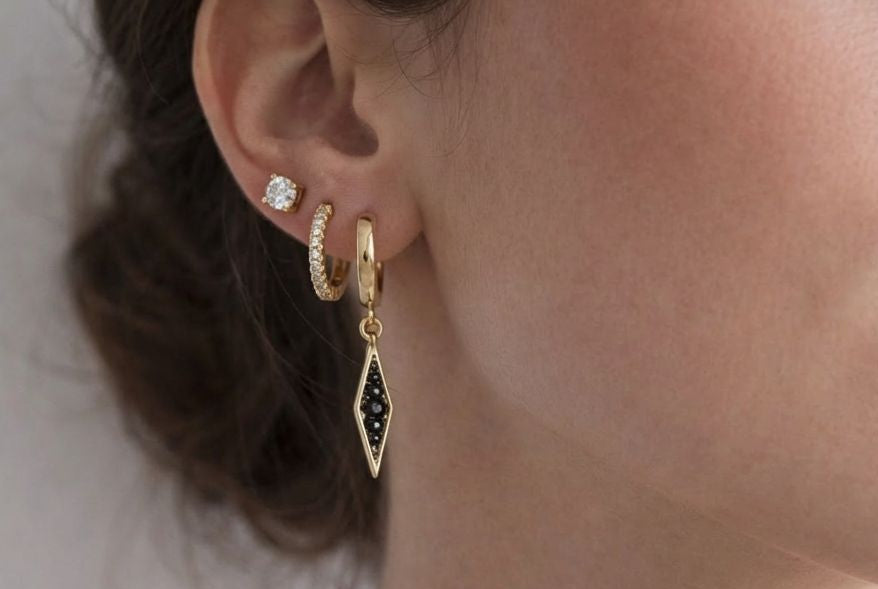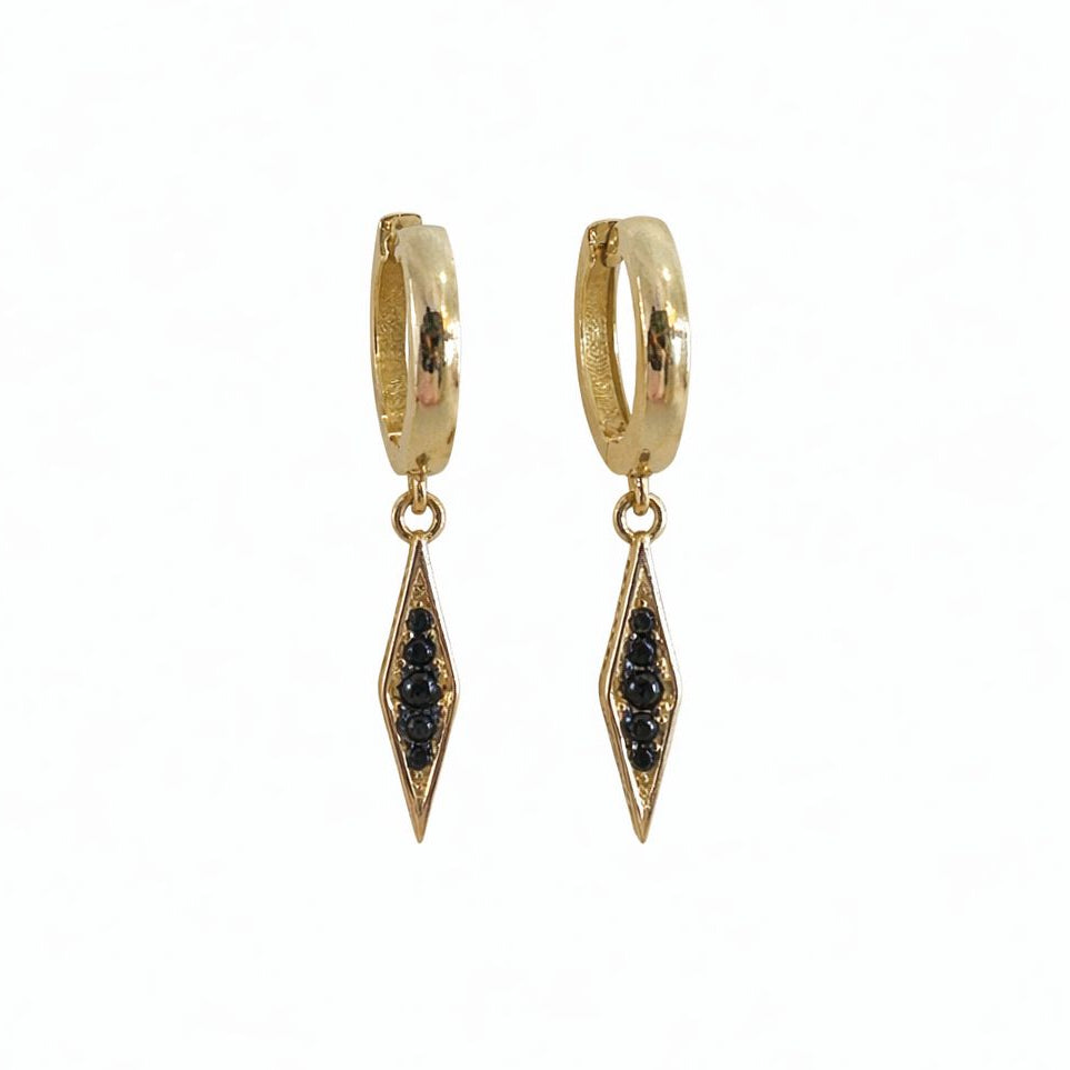עגילי חישוק נופלים בעיצוב אלגנטי ומודרני, זהב איכותי, עם אלמנט גאומטרי עדין המשובץ אבני זירקון שחורות בוהקות.