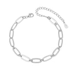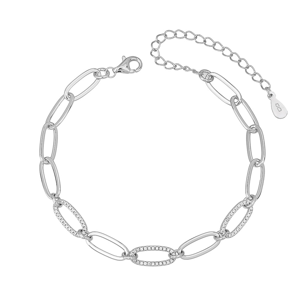 צמיד טרנדי בעיצוב מודרני עם חוליות גדולות בסגנון משולב - חלקן חלקות וחלקן משובצות באבני זרקון לניצוץ אלגנטי ומעודן. עשוי כסף אמיתי 925 עם שרשרת הארכה להתאמה מדויקת לפרק כף היד. אידיאלי ללבישה יומיומית או לשדרוג מראה ערב.