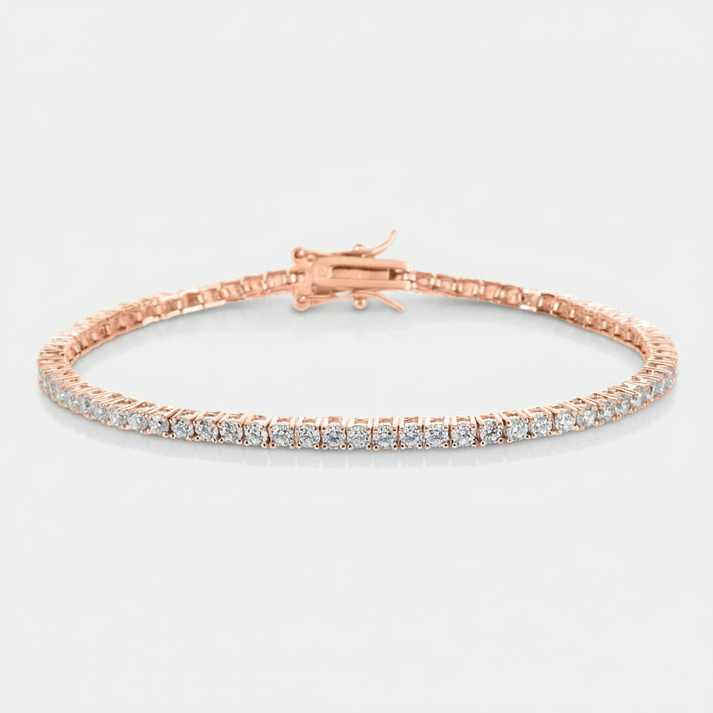 צמיד טניס קלאסי בציפוי זהב רוז גולד, משובץ אבני זירקון מבריקות לאורך כל הצמיד.עיצוב על-זמני שמעניק מראה יוקרתי ונוצץ, ומתאים גם ליום-יום וגם לערב.ניתן לבחור את אורך הצמיד להתאמה מושלמת ליד.