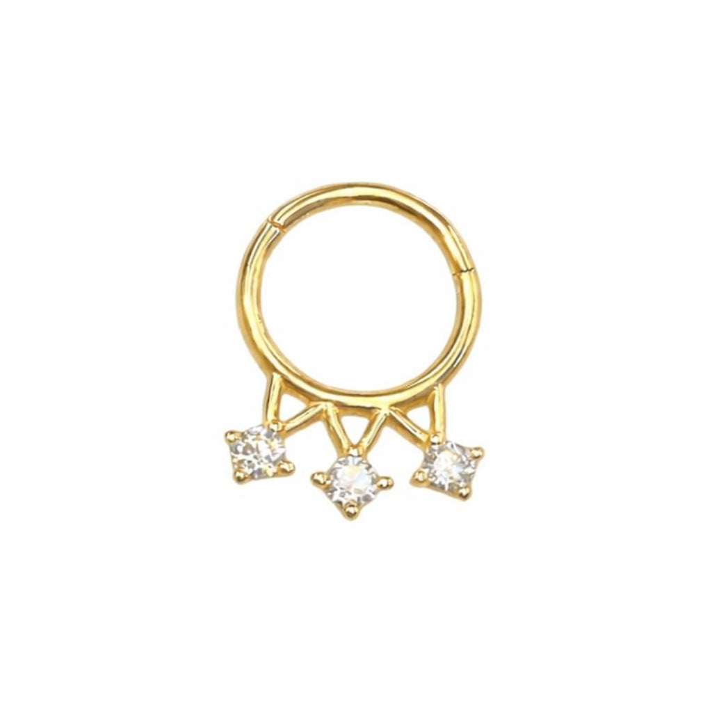 פירסינג חישוק מזהב 14 קראט בעיצוב כתר אלגנטי, משובץ שלושה זרקונים מבריקים היוצרים מראה מלכותי ועדין בו־זמנית.
