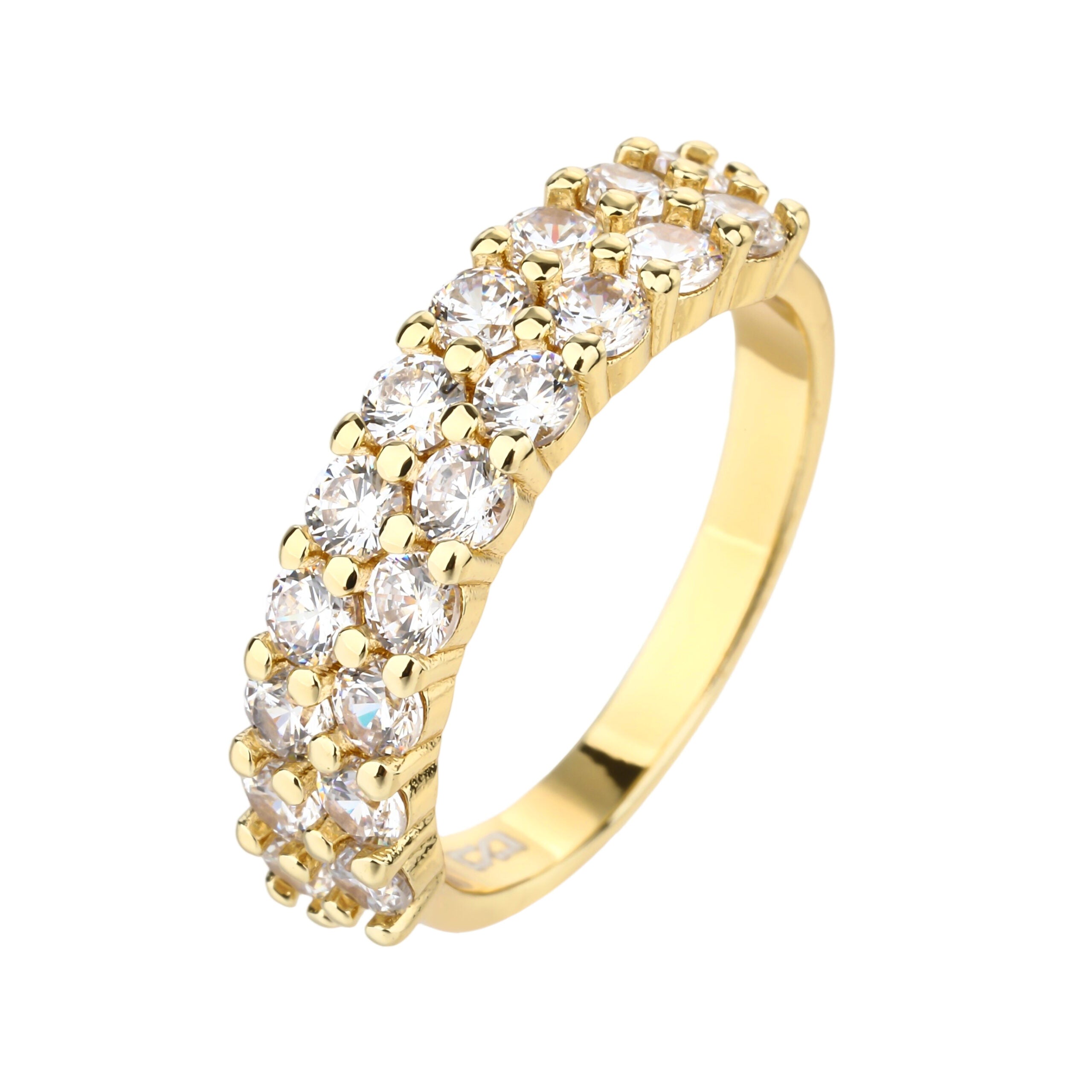 טבעת אלגנטית בעיצוב קלאסי, מצופה זהב איכותי ומשובצת אבני זירקון בוהקות המוסיפות לה ברק יוקרתי ועדין.הטבעת מתאימה לשימוש יומיומי או לערב, ויכולה להשתלב בקלות עם טבעות נוספות ליצירת מראה שכבות מרשים.