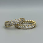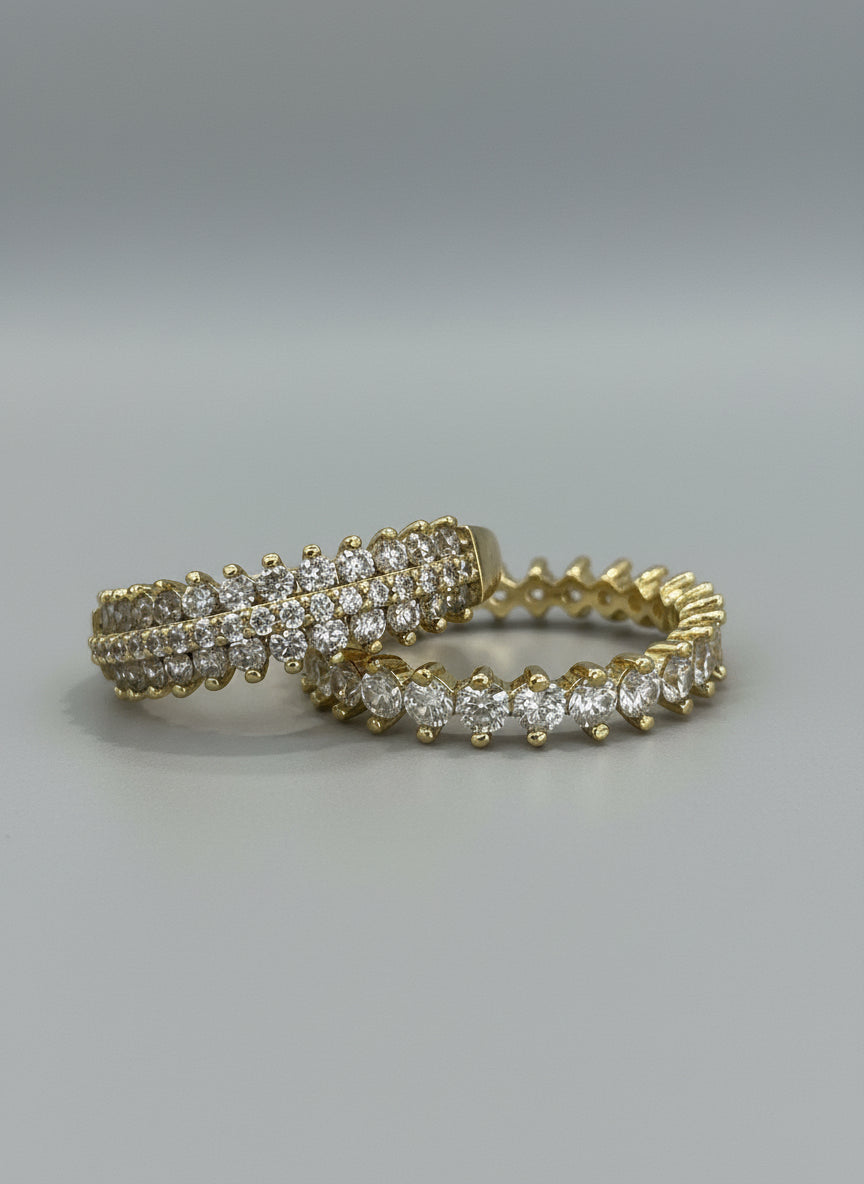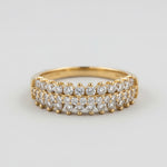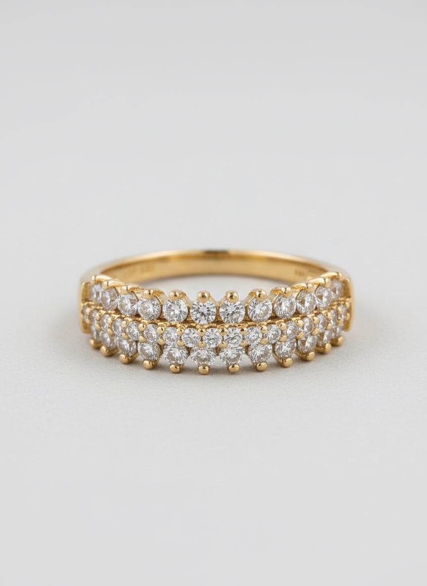 טבעת ציפוי זהב יוקרתית בעיצוב רחב ומרשים, המשובצת שתי שורות צפופות של אבני זירקון נוצצות המדמות יהלומים אמיתיים.